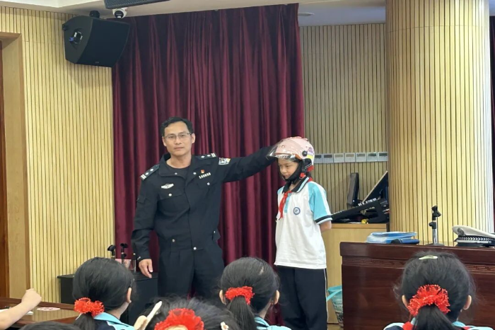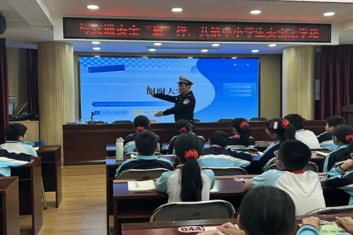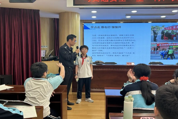 活动中,民警通过播放根据真实案例改编的未成年人交通安全警示教育片,以案说法,直观地向同学们展示交通违法行为带来的严重后果和生命的脆弱。同时,结合上下学途中常见的交通场景,讲解骑行自行车和电动自行车的年龄要求以及如何安全骑行、如何规避车辆盲区等实用技能。民警还教同学们学习认识交通指挥手势,采用问答方式活跃气氛,让孩子们在寓教于乐中学习交通安全知识。同时还倡导同学们通过“小手拉大手”的方式,将课堂上学到的安全知识带回家,提醒家长自觉遵守交通法规,驾乘电摩出行养成“早点走 靠右行 慢慢开”的良好习惯。