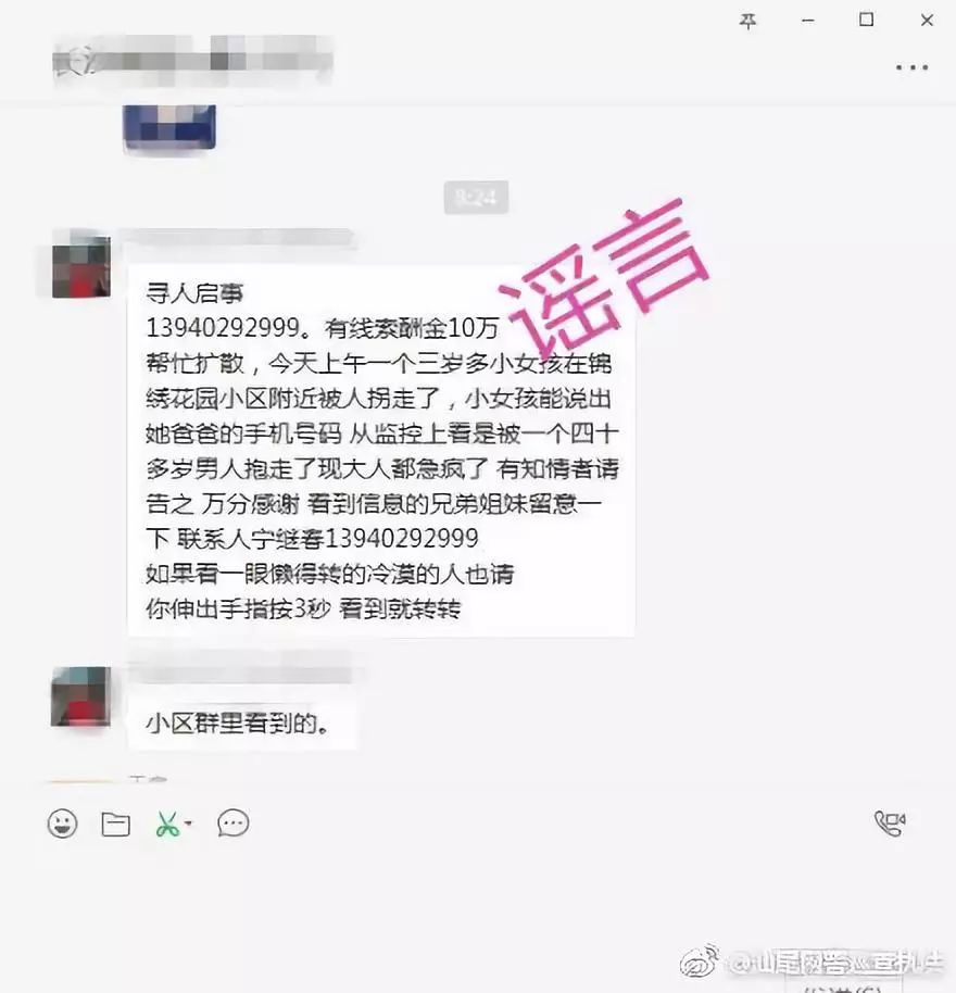 网警在巡查工作中发现微信朋友圈内多人转载消息称:三岁小女孩在锦绣花园被人拐走,请大家帮助寻找,并留下一个139的联系电话实际上,该谣言已在互联网上流传多年,各地警方已多次辟谣,媒体曾在2015年专门辟谣,对比类似谣言信息发现,内容基本相同,甚至连语句都是一致的,比如都没有写清孩子的体貌特征,比如身高、面部特征、口音等,只是含糊地说“3岁小孩”。不同的是两个方面:一是走失地点变了。以前是沃尔玛、万达广场、家乐福等全国各个城市都会出现的大商场,或者是怡馨家园、世纪花园等多个城市都会出现的大众化小区名称;二是联系人以及手机号变了。以前出现过“郑春荣1396959xxxx”、“张静杰1375969xxxx”,这次则是“宁继春1394029xxxx”。此外,这次更吸引人的是,“有线索酬金10万元。”