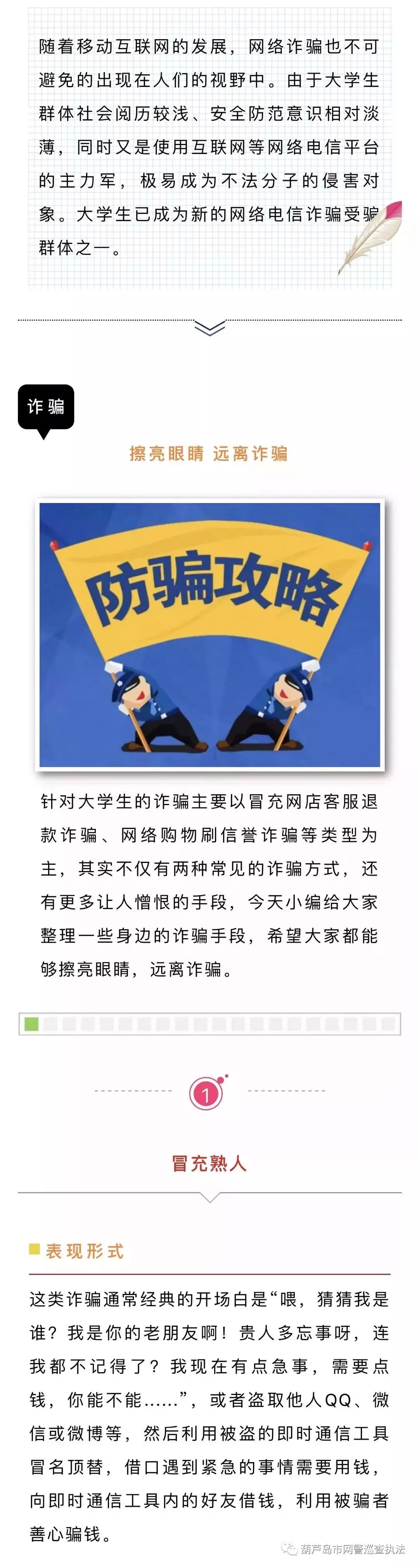 随着移动互联网的发展,网络诈骗也不可避免的出现在人们的视野中。由于大学生群体社会阅历较浅、安全防范意识相对淡薄,同时又是使用互联网等网络电信平台的主力军,极易成为不法分子的侵害对象。大学生已成为新的网络电信诈骗受骗群体之一。我们为大家整理了两点防诈骗小知识,希望大家能够认真阅读哦。