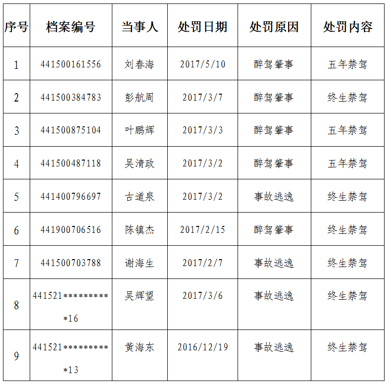 关于公布2017年第一批禁驾驾驶人名单的通告