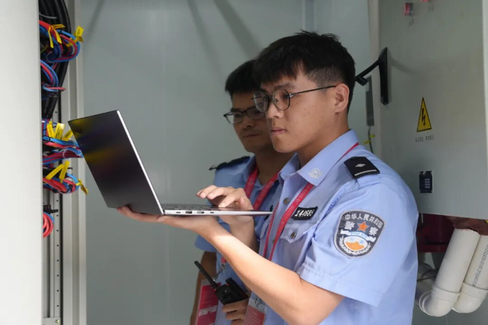 “小林,这个接口一定要拧紧,海风潮湿,一点疏忽就可能造成信号波动。”曾源能语气温和,但目光如炬,不漏掉任何一个细节,林锦和则端着检测设备认真聆听。入职3年多,他已是队里的技术骨干,师傅那句“保障通信,就是守护安保的生命线”他已牢记在心。