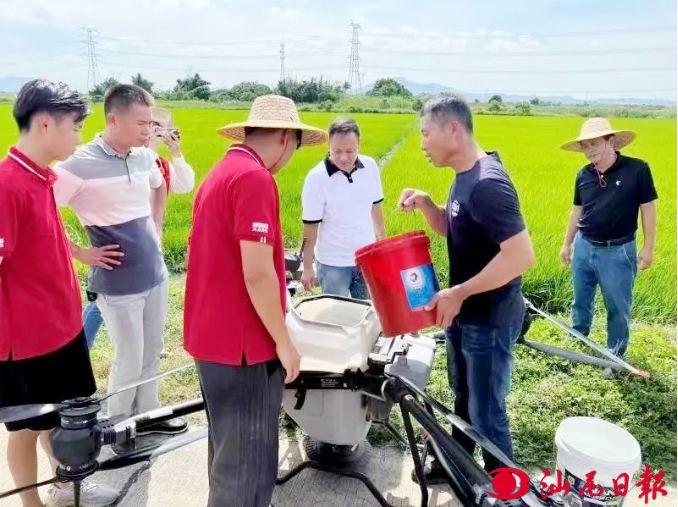 陆丰供销社组织党员干部下乡指导农户正确使用农药。