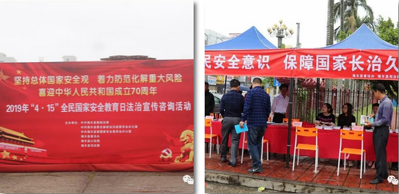 4月12日上午,中共海丰县委政法委、县委依法治县办、县委国安办、县普法办、县公安局、县司法局联合在县法治文化主题公园(县烈士陵园南门)开展以“坚持总体国家安全观,着力防范化解重大风险,喜迎中华人民共和国成立70周年”为主题的“4.15”全民国家安全教育日法治宣传咨询活动。