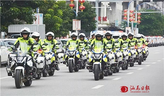 公安武装巡游队伍沿街巡游,营造扫黑除恶浓厚氛围。