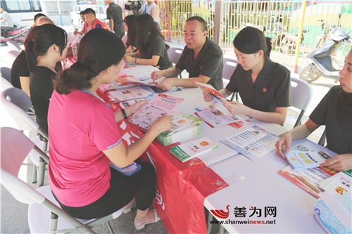 妇联干部职工正向商户发放宣传资料。