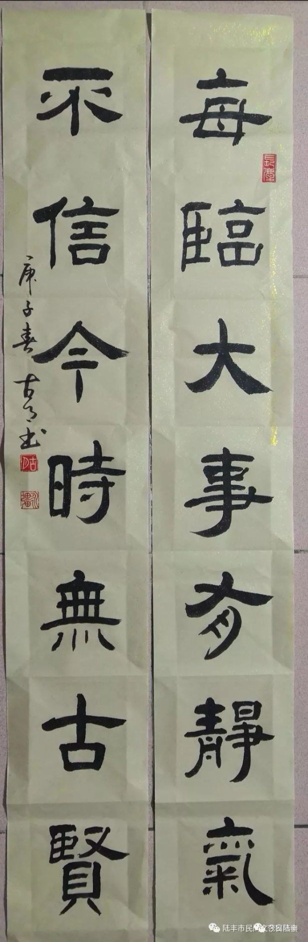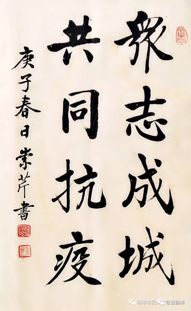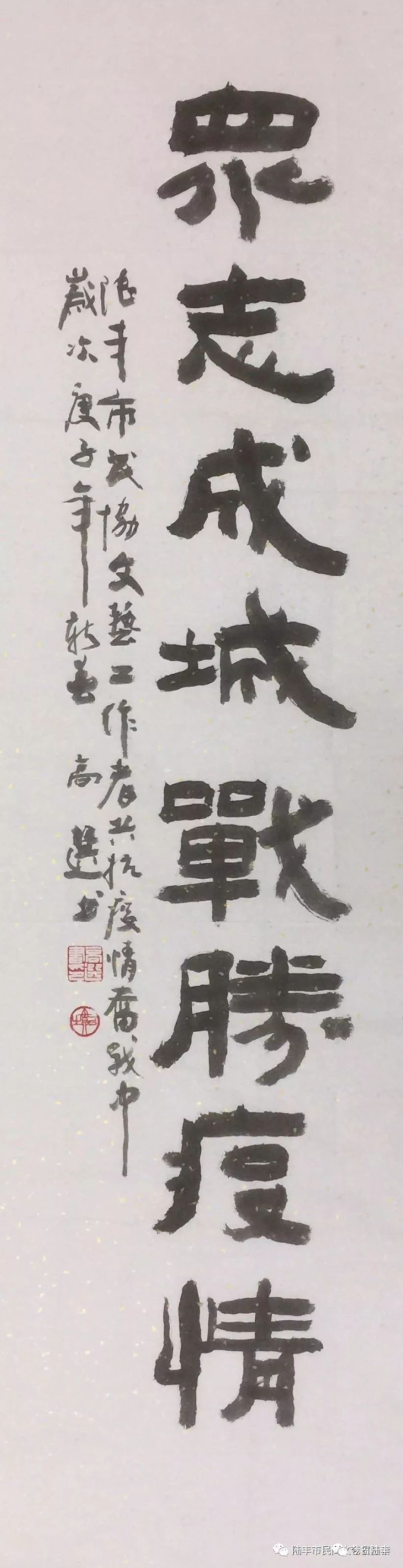 新型冠状病毒感染的肺炎疫情牵动着无数人的心,在这场没有硝烟的斗争中,医护人员、公安民警、各级党员干部冲在一线守护着大家的健康。在全国上下团结一心抗击疫情的当下,陆丰市委宣传部号召全市书法爱好者迅速行动起来,创作一批鼓舞群众、凝集人心、提振信心的书法作品,为全市人民抗击疫情助力加油。陆丰市民间文艺家协会积极行动起来,创作了一批反映人民群众万众一心、众志成城抗击疫情的书法作品,传播正能量、讴歌真英雄,增强人们战胜疫情的信心。