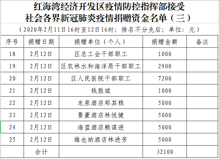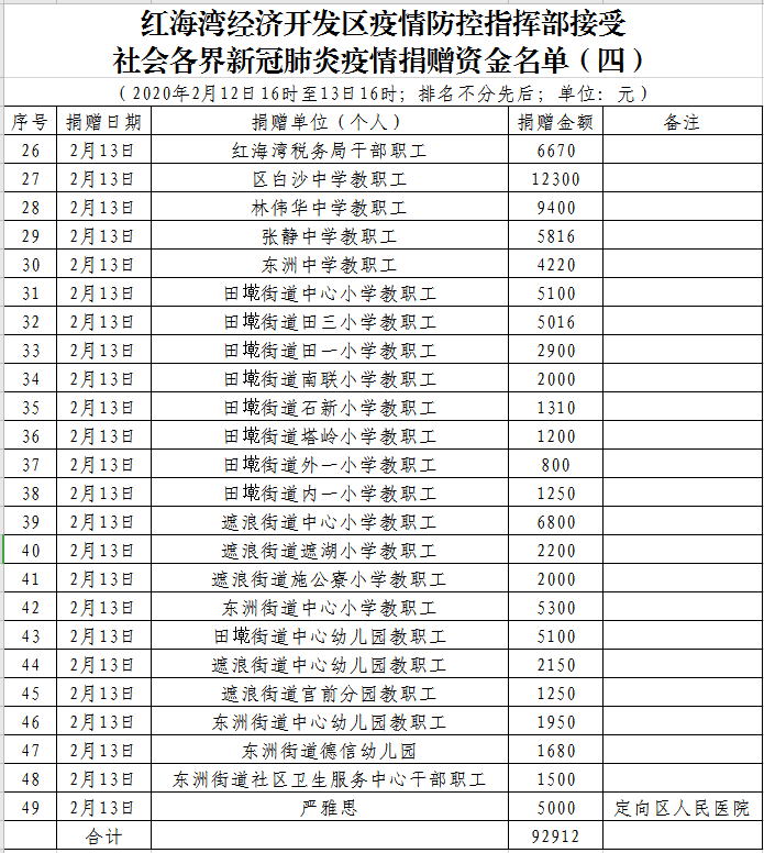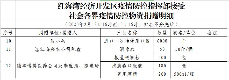 新型冠状病毒感染的肺炎疫情发生以来,红海湾经济开发区疫情防控指挥部积极发动、广泛动员,红海湾各界人士守望相助、慷慨解囊。2月11日16时至2月13日16时,指挥部接收捐赠款125012元,累计197468元,接收捐赠物资一批,详细如下表。捐赠款物由我区新型冠状病毒感染的肺炎疫情防控指挥部统一调度使用,用于我区疫情防控工作。