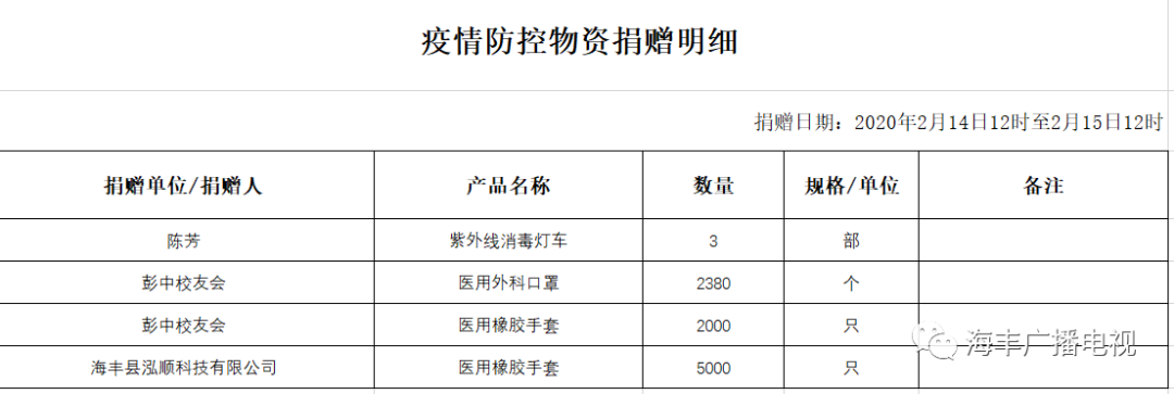 海丰县新型冠状病毒感染的肺炎疫情防控指挥部接受物资明细情况: