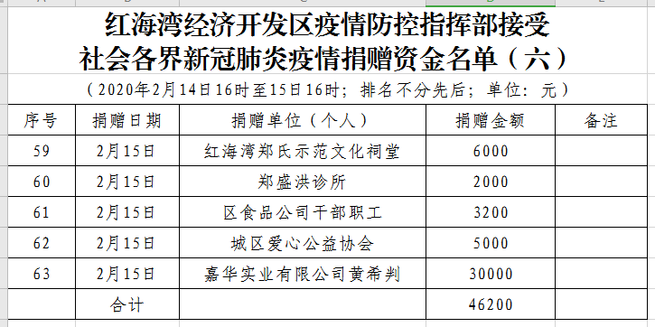 新型冠状病毒感染的肺炎疫情发生以来,区疫情防控指挥部积极发动、广泛动员,红海湾各界人士守望相助、慷慨解囊。2月14日16时至2月15日16时,指挥部接收捐赠款46200元,累计298384元,接收捐赠物资一批,详细如下表。捐赠款物由我区新型冠状病毒感染的肺炎疫情防控指挥部统一调度使用,用于我区疫情防控工作。