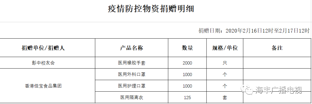 海丰县新型冠状病毒感染的肺炎疫情防控指挥部接受物资明细情况: