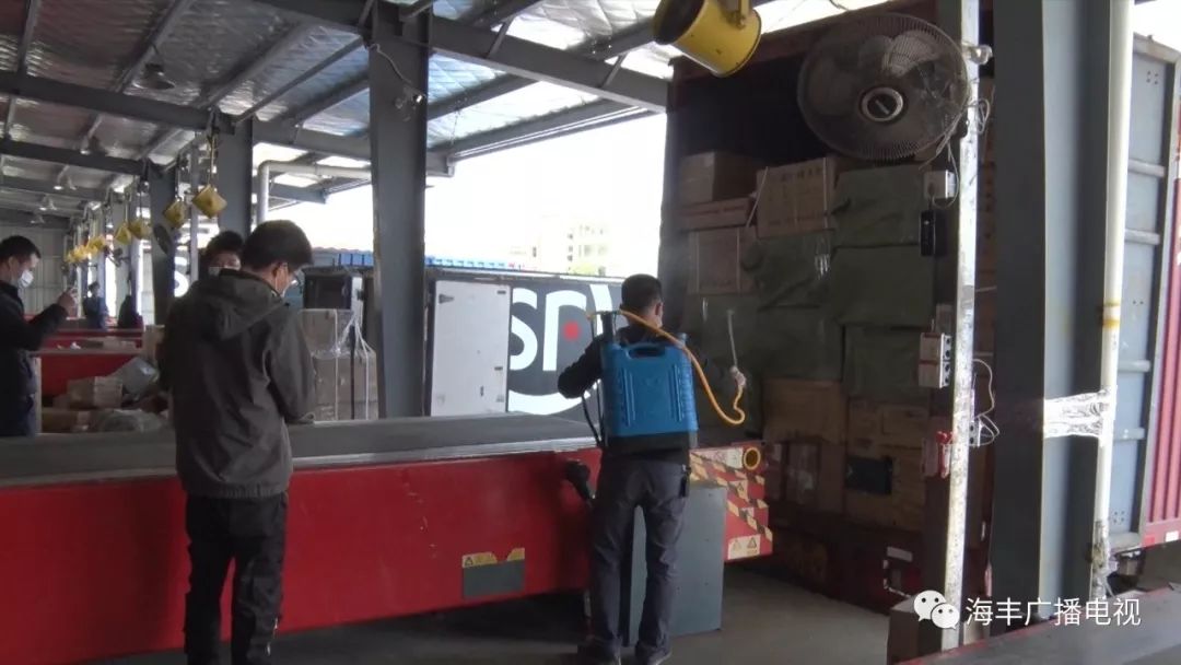疫情防控期间,进入顺丰快递海丰集散中心的一切转运货物的车辆都必须经过严格的消杀,人员都要测量体温并登记信息,所有货物更是逐一进行消杀,“硬核”阻断疫情传播途径。