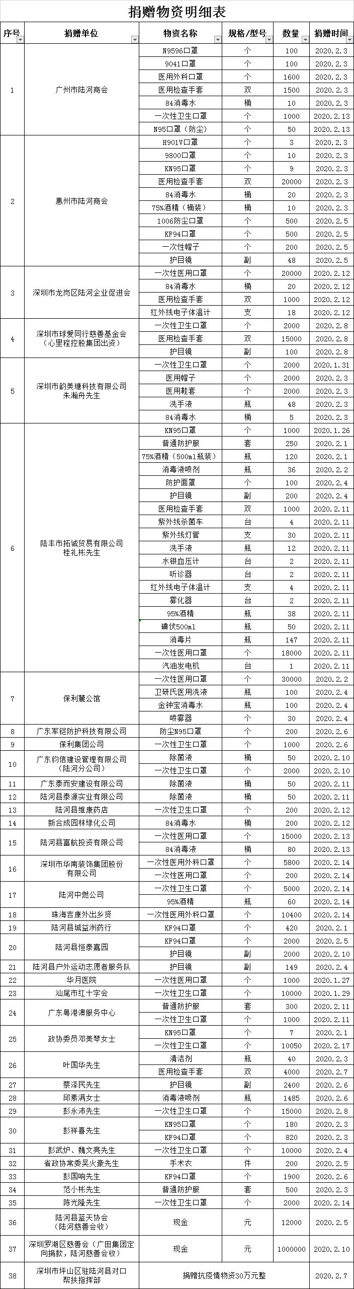 面对突如其来的新型冠状病毒感染的肺炎疫情,陆河县万众一心,社会各界热心人士守望互助、慷慨解囊,为这场战“疫”尽自己的一份力量。当前,我县疫情防控形势依然严峻,医疗物资紧缺,希望大家继续为陆河抗疫工作捐款捐物。捐赠款物由我县新型冠状病毒感染的肺炎疫情防控指挥部统一调度使用,悉数用于我县疫情防控工作。