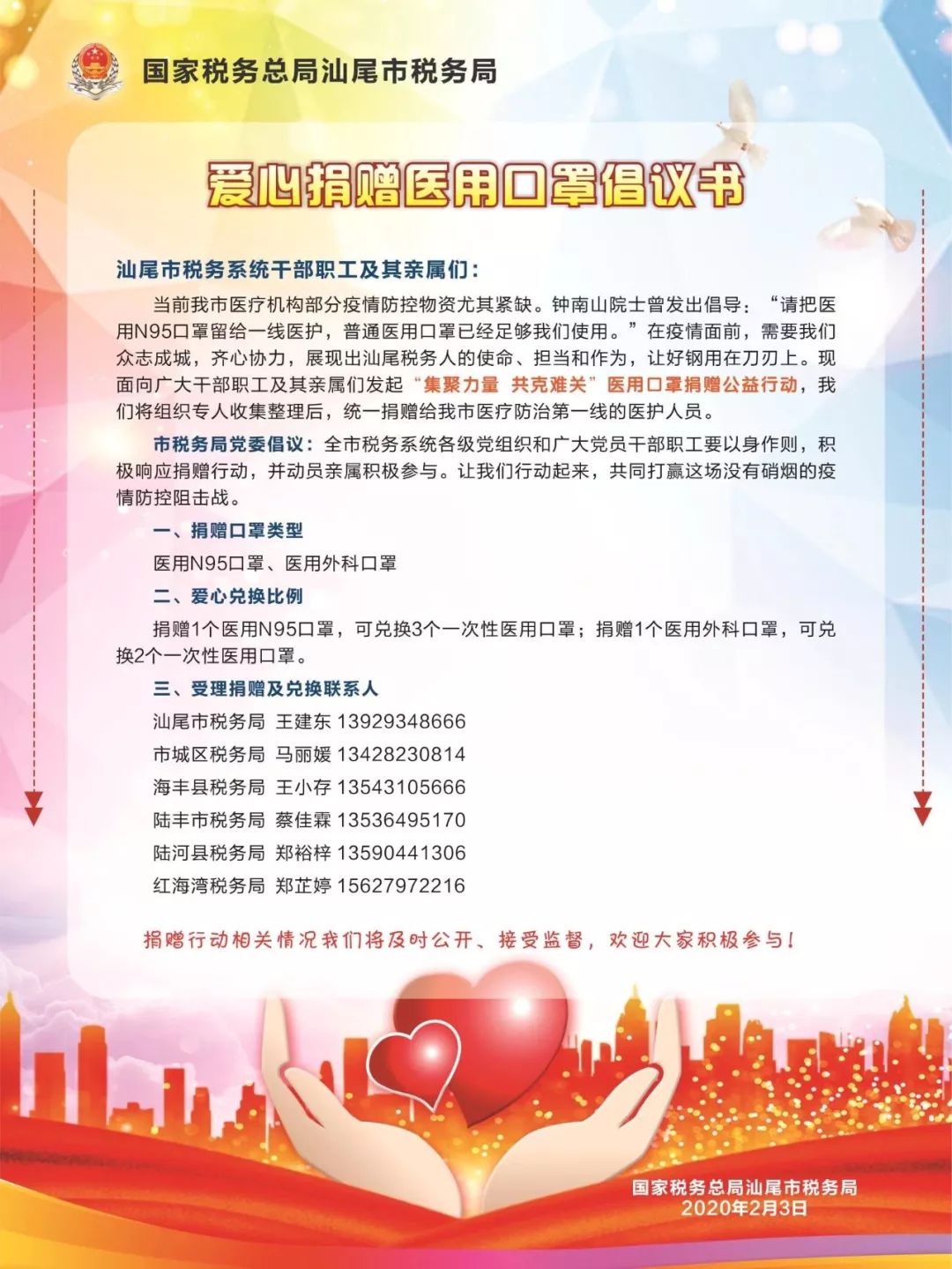 税务发出爱心捐赠医用口罩倡议书