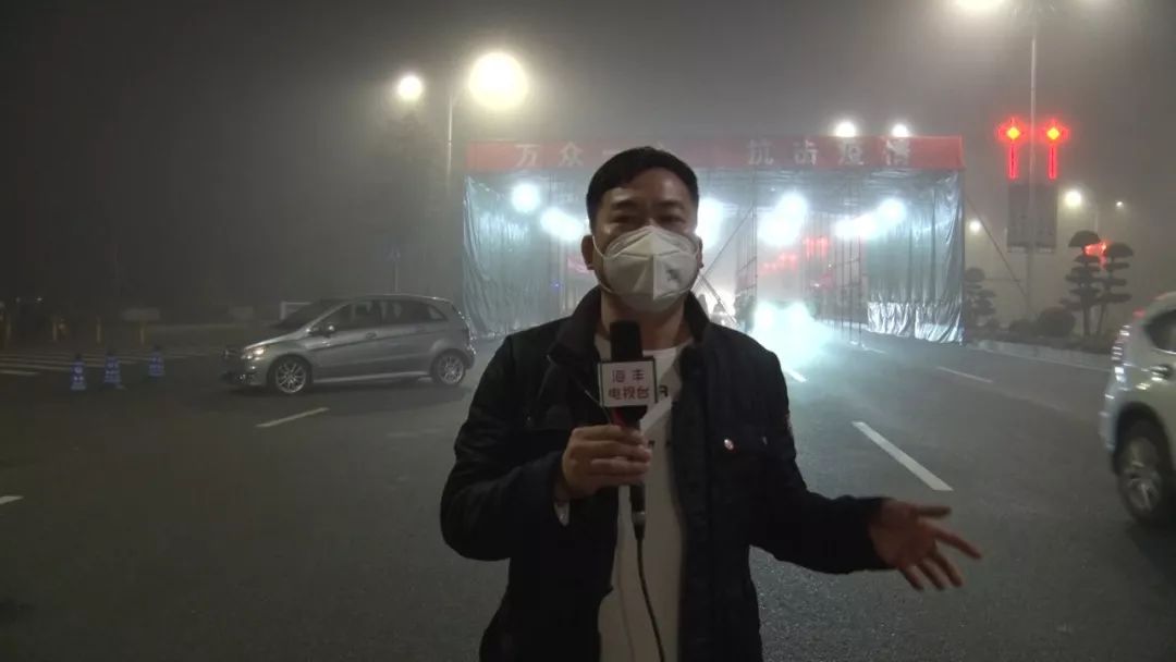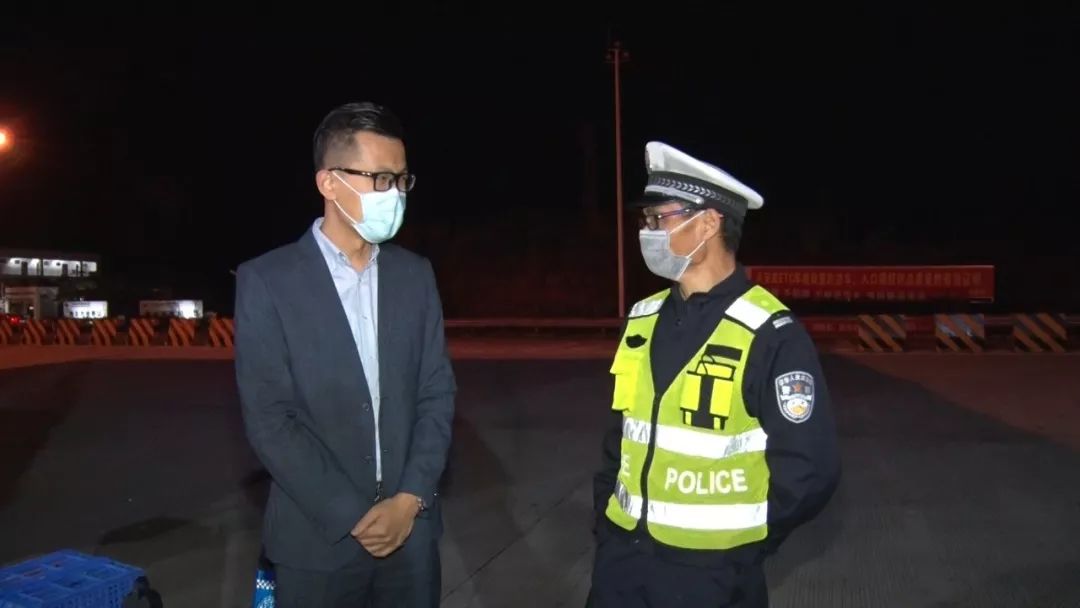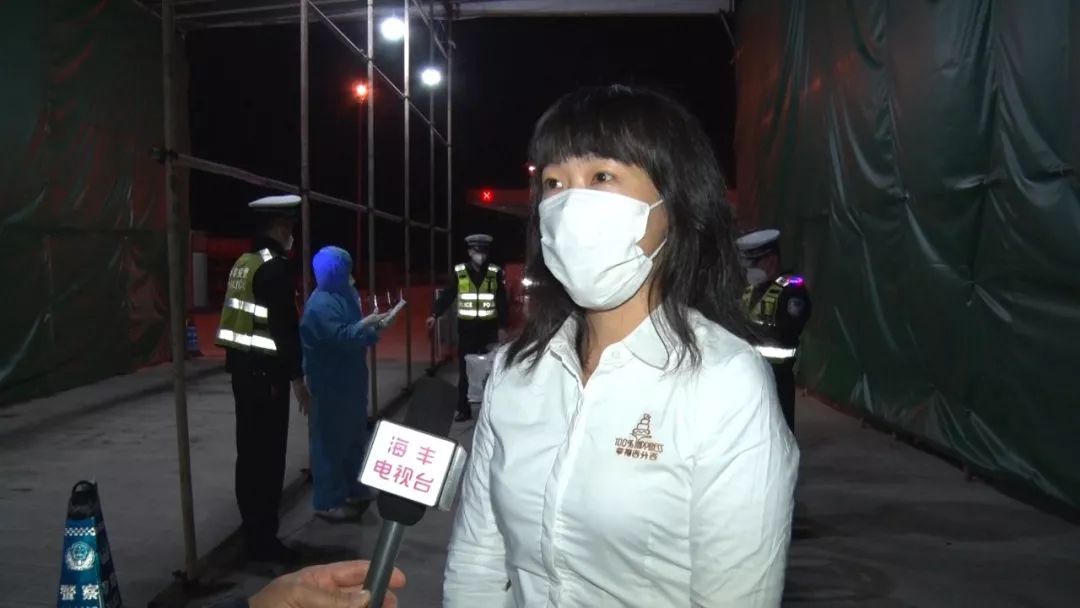 观众朋友大家好!现在是晚上的十二点,我所在的位置是海丰西闸疫情防控检查卡口,我身后是工作人员正在对进入海丰车辆人员进行体温检测和身份证登记的场面。也就在这个时候,有社会的热心人士为防控一线的工作人员送来面包,提供后方物质保障,共同担当一份社会责任。 每到一处,面包店的员工们与防疫一线的工作人员互相嘘寒问暖,打成一片。通过连续几天来的接触和互动,他们都已熟络起来了。幸福百分百食品公司员工将一袋袋还带着热气的爱心面包送到正在值班执勤的工作人员手中,向他们致以敬意。