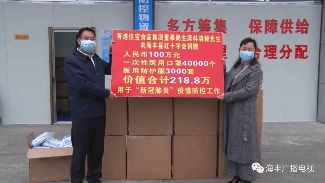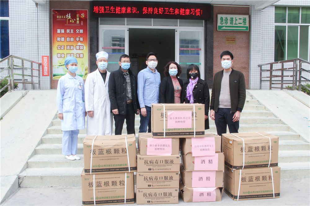 陆丰博美医药公司及李世摺先生、陈惠玲女士向红海湾区人民医院共捐赠板蓝根颗粒500大包、抗病毒口服液180盒、75%医用酒精500ml共200瓶。