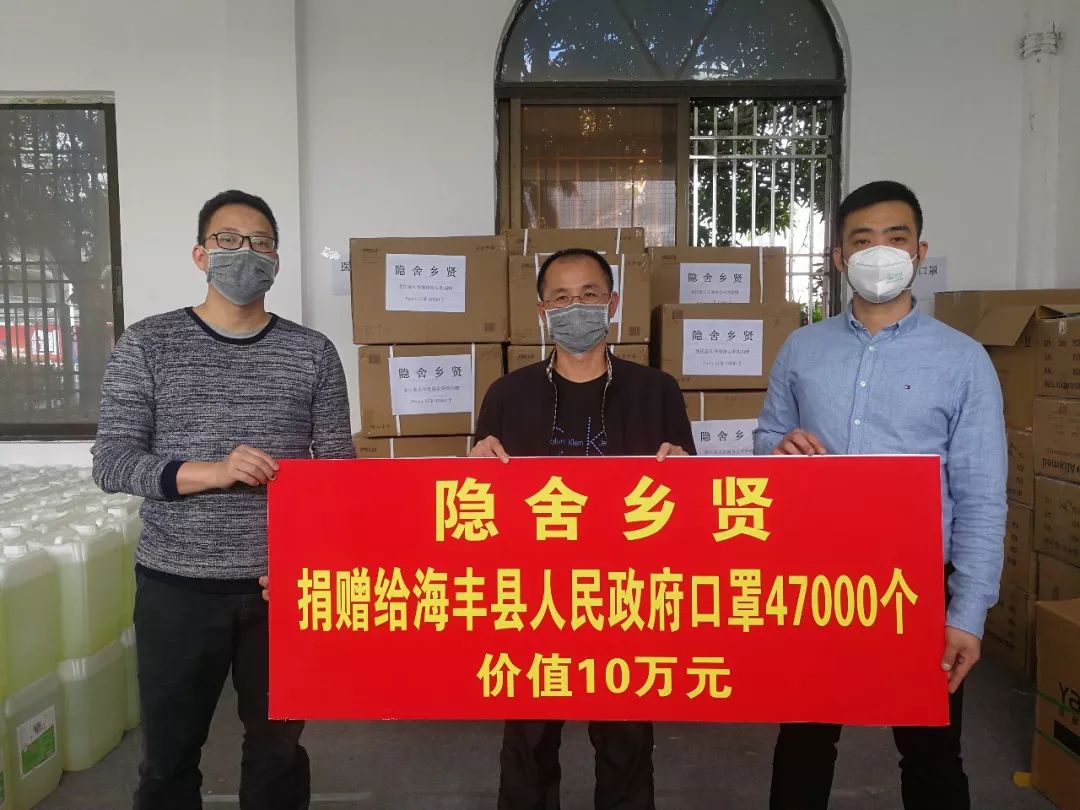 隐舍乡贤向海丰县人民政府捐赠4.7万个口罩,向彭湃纪念医院、中医院、妇幼保健院等捐赠医用护目镜共600个,向彭湃中学捐赠口罩500个。