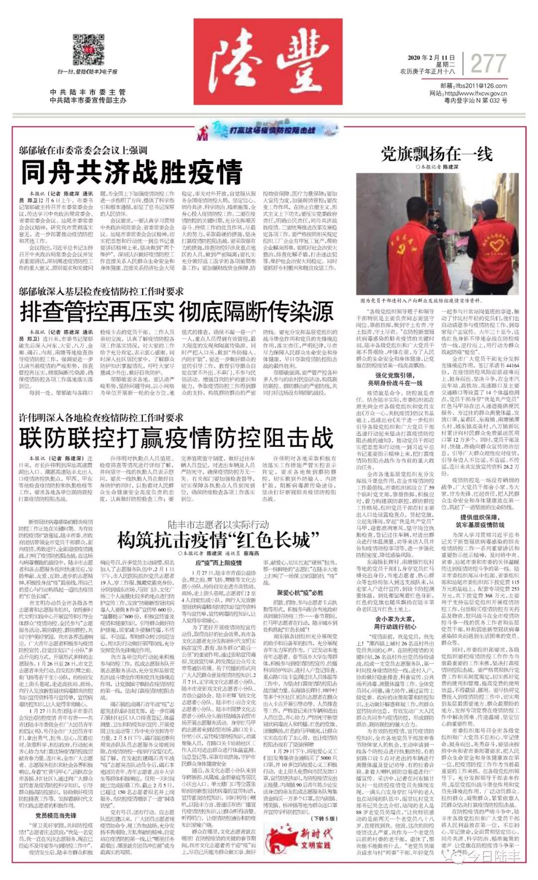 和平年代的英雄不仅是医护人员,还有发挥先锋模范作用的普通党员,还有奉献爱心的普通群众,《陆丰》编辑部的记者、通讯员拿起相机和笔,用心记录下感人的一幕幕,采写了《镇村联防联控,民众群防群控——陆丰河西镇形成全镇疫情防控强大态势》《湖东镇党员志愿者在疫情防控一线当先锋作表率 党团共筑防疫城墙》《看到pc蛋蛋 无新增就很开心——陆丰人元宵节在外地不回家不添乱》《城东镇淡水村干群齐抗“疫”》等宣传报道。正如有网友的留言:“这个特殊时刻,逆行的何止医护人员,新闻人亦逆行,随时准备出征到抗疫前行。