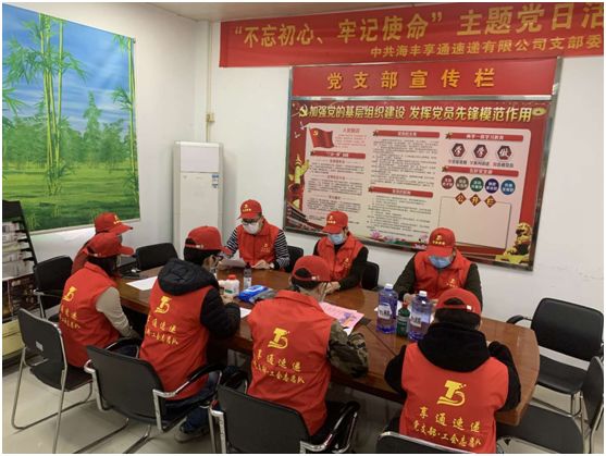 为深入学习贯彻习近平总书记关于新冠肺炎疫情防控工作的重要讲话和重要指示精神,积极响应市非公党工委的号召,全力支持推动企业安全有序复工复产,海丰享通速递有限公司党支部充分发挥企业党组织政治引领作用,坚持党建带工建,联合该公司工会成立抗疫志愿服务队,督促指导公司及下属11个分公司、5个末端站点严格做好登记报备、体温检测、包裹消杀、分散用餐、环境消毒等工作,切实加强员工健康防护,有力推动快递企业安全有序复工复产,更好地满足疫情防控和群众生活物资配送需要,让党旗在企业疫情防控和复工复产第一线高高飘扬。截至2月20日,该公司及下属11个分公司、5个末端站已全部复工,复工率为100%,到岗人数225人,到岗率为100%。