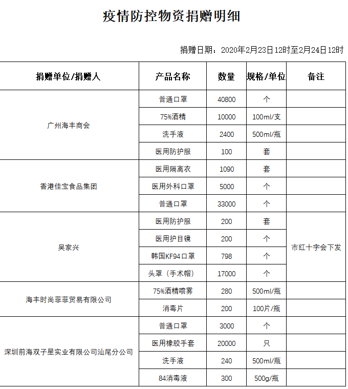 海丰县新型冠状病毒感染的肺炎疫情防控指挥部接受物资明细情况: