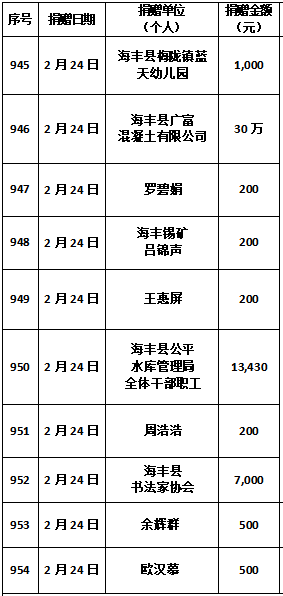 万众一心抗疫情。面对突如其来、影响全国的新型冠状病毒感染的肺炎疫情,海丰各界人士守望互助、慷慨解囊,为这场战“疫”尽自己的一份力量。 据了解,截至2月24日16:00,海丰县红十字会累计接收捐赠款12,491,604.73元。捐赠款物由我县新型冠状病毒感染的肺炎疫情防控指挥部统一调度使用,用于我县疫情防控工作。受赠单位:海丰县防控新型冠状病毒感染的肺炎疫情指挥部联系电话:0660-6600023,18998529822办公地址:海丰县海城镇海银路9号妇幼保健院前座五楼捐款账号:44050173710500000688(截至2020年2月24日16时;排名不分先后;单位:元)