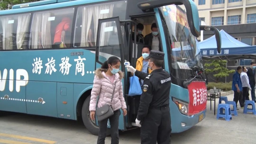 现在车辆已经来到海丰星际动漫科技发展有限公司,公司的负责人和海丰县人社局的负责人也早早地来到这里等候大家,第一时间欢迎员工的到来。在现场我们也看到工作人员在为返岗员工再次进行体温监测和登记,为他们的复工复产提供最基本的保障。