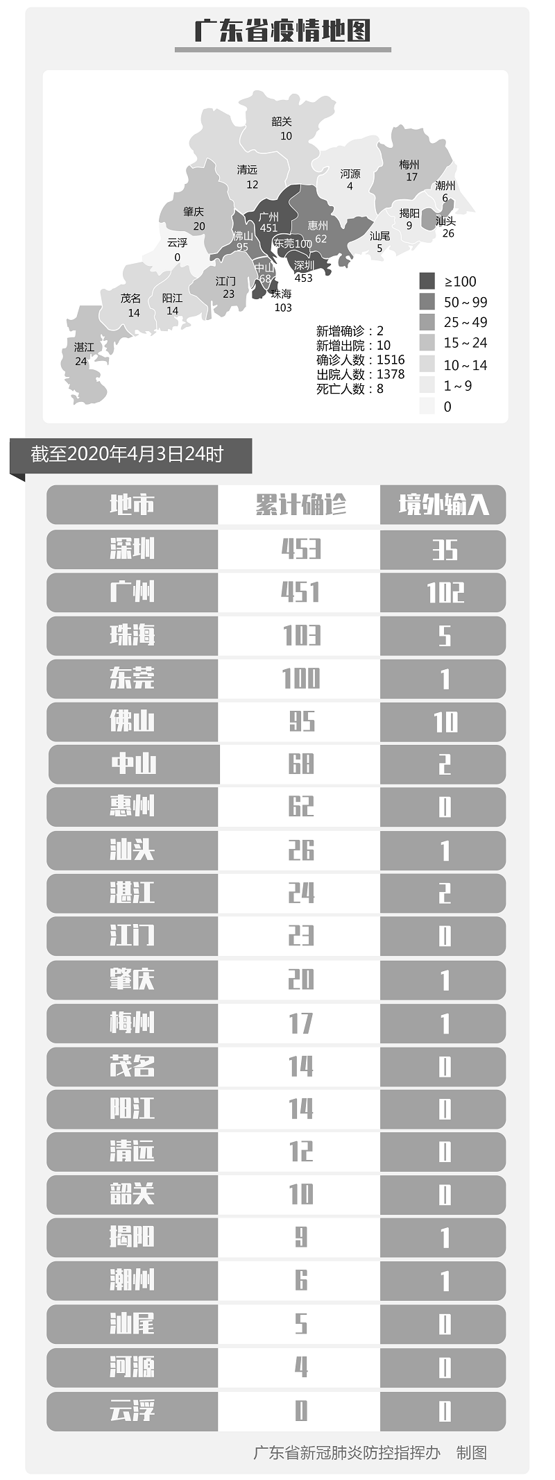 截至4月3日24时,全省累计报告新冠肺炎确诊病例1516例,累计出院1378例,累计死亡8例。