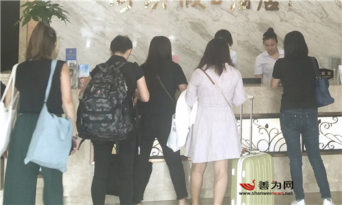 国庆期间,旅客在酒店前台排队办理入住手续。