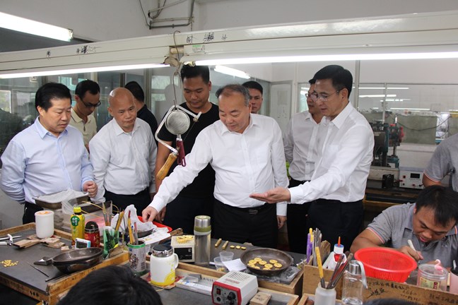 会后,蔡少华一行到梅陇镇珠宝首饰企业实地调研,现场了解珠宝首饰生产加工状况,要求企业要依法经营,诚信经营,以“打造自主品牌”为长期发展目标,建立属于自己的品牌商标,争做行业领军者,为梅陇争光。