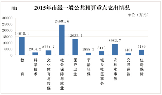 (2)2015年市级支出预算安排。根据收支平衡的原则,2015年市级一般公共预算支出相应安排159186万元,比上年增长11.65%。主要支出项目拟安排如下: