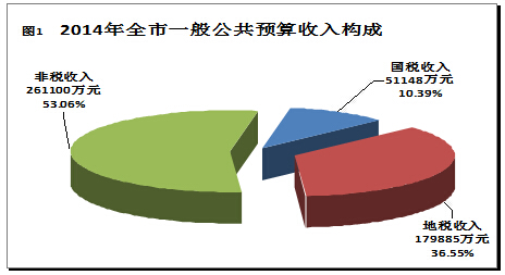 2014年,全市一般公共预算收入完成492133万元,完成年度预算的87.75%,比上年增收10588万元,增长2.2%。其中:国税部门完成税收收入51148万元,完成年度预算的93.7%,同比增长12.15%;地税部门完成税收收入179885万元,完成年度预算的58.24%,同比下降30.29%;非税收入完成261100万元,完成年度预算的132.25%,同比增长46.76%。全市一般公共预算支出完成1248242万元,完成年度预算的175.5%,比上年增支195133万元,增长18.53%。