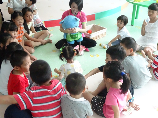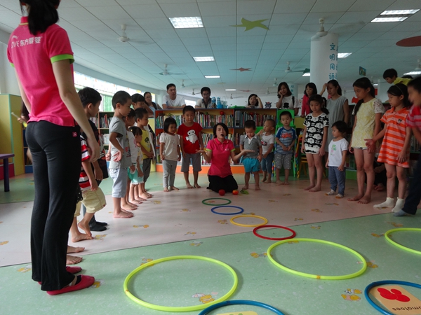 本次的英语阅读活动分为三个部分:1、志愿者把三样水果(苹果、葡萄、番茄)放入袋子中,让小读者们从袋子中取出水果,并用英文说出水果的名字,从而熟悉英文单词apples、grapes、tomatoes。2、志愿者在地上放置了呼啦圈和几个不同水果的小篮子,小读者们选择一种水果,沿着呼啦圈跳到对应水果的篮子面前,大声说出水果的英文单词并将水果放入篮子中。3、志愿者怀里的小熊饿了,想吃水果。小读者们根据志愿者说出的英语单词去寻找小熊想吃的水果,并将水果交到志愿者手中。