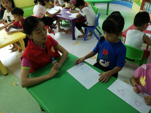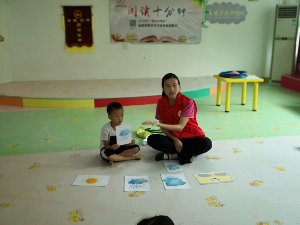 “兴趣是最好的老师。”为了激发和培养小朋友们学习英语的兴趣,志愿者老师巧妙地运用“天气卡片”,带领着小朋友们在认识天气的过程中学会简单的有关天气的英语。在教学过程中,为了让小朋友们印象更加深刻,志愿者老师注重与小朋友们交流,通过模仿“下雨声”、“热”等动作,在一问一答中让小朋友们主动了解和认识天气,引导小朋友们说出卡片对应天气的英语。
