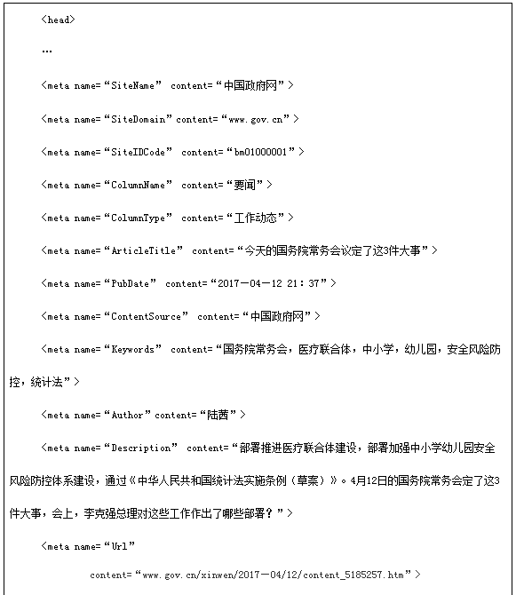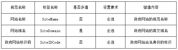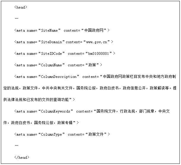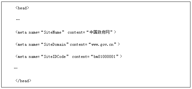 网页标签是指网页模版中对有关展现内容进行标记而设置的标签,通常包括网站标签、栏目标签、内容页标签等。政府网站要在页面源代码“〈head〉…〈/head〉”中以meta标签的形式,对网站名称、政府网站标识码、栏目类别等关键要素进行标记,标签值不能为空。