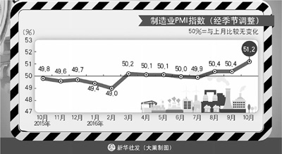 中国物流与采购联合会、国家统计局服务业调查中心1日发布,10月份中国制造业采购经理指数(PMI)为51.2%,较上月上升0.8个百分点,自2014年10月份以来首次回升到51%以上。主要分项指数普遍回升,高于去年同期1个百分点以上。综合来看,PMI回升特点明显,回升幅度较大,回升覆盖面较广,显示当前经济走势稳中有升。