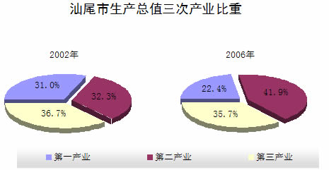 产业结构进一步调整优化。三次产业结构由2005年的24.0:39.7:36.3调整为22.4:41.9:35.7,第二产业比重明显加大,对国民经济的拉动作用增强。