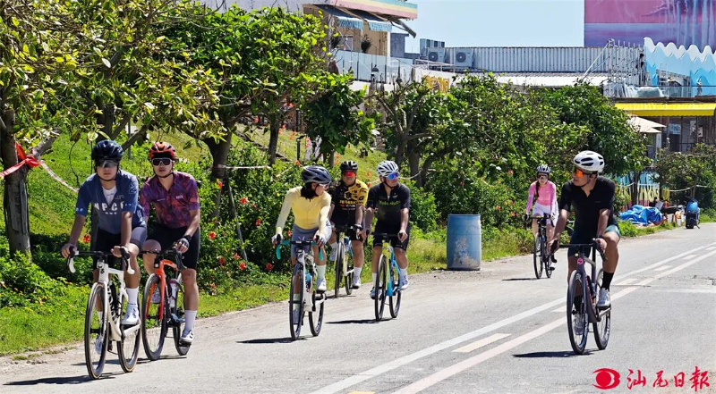 假期第一天,自行车骑行车队来到红海湾开发区遮浪街道咖啡一条街打卡。