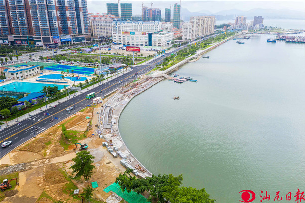 记者在现场看到,总面积约1638平方米的亲水平台已具雏形。据业主方市代建项目事务中心负责人介绍,本项目金湖路与湖滨大道交叉口节点(健身广场南侧),原状南侧临海路段慢行空间不足(仅为3.5米),同时无城市景观带,是道路景观提升的限制因素。这次将拓宽结构物,样式采用台阶+人行步道平台、结构采用桩基础+墩台的形式。南侧临海段拓宽4.2至12米,总面积约1638平方米,以解决慢行空间不足的问题,提升城市滨海景观品质。