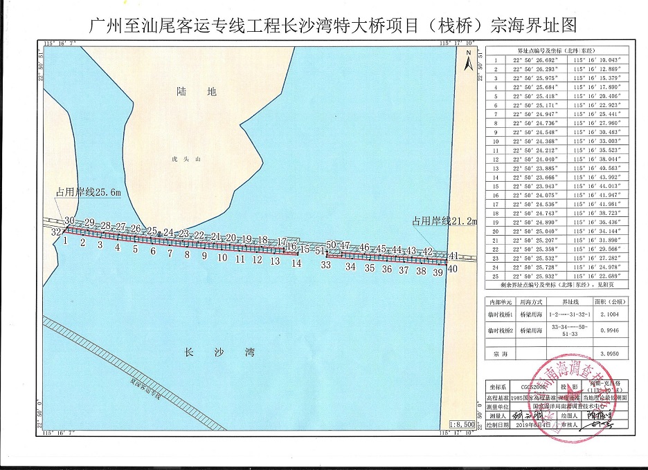 广东广汕铁路有限责任公司拟在市城区红草镇和海丰县梅陇镇之间建设广州至pc蛋蛋 客运专线长沙湾特大桥项目,项目位于厦深铁路跨海大桥以北约750m,东西向跨越长沙湾海域。项目涉及用海分为大桥主桥和临时施工栈桥,其中大桥主桥申请用海面积5.3155hm2,大桥跨海段长度1564.61m,主桥占用人工岸线193米,主桥用海年限40年;临时施工栈桥申请用海面积3.0950hm2,用海年限3年。用海性质为公益性,用海类型为交通运输用海中的路桥用海,用海方式为构筑物中的跨海桥梁用海(具体范围见附图)。有关事宜公示如下: