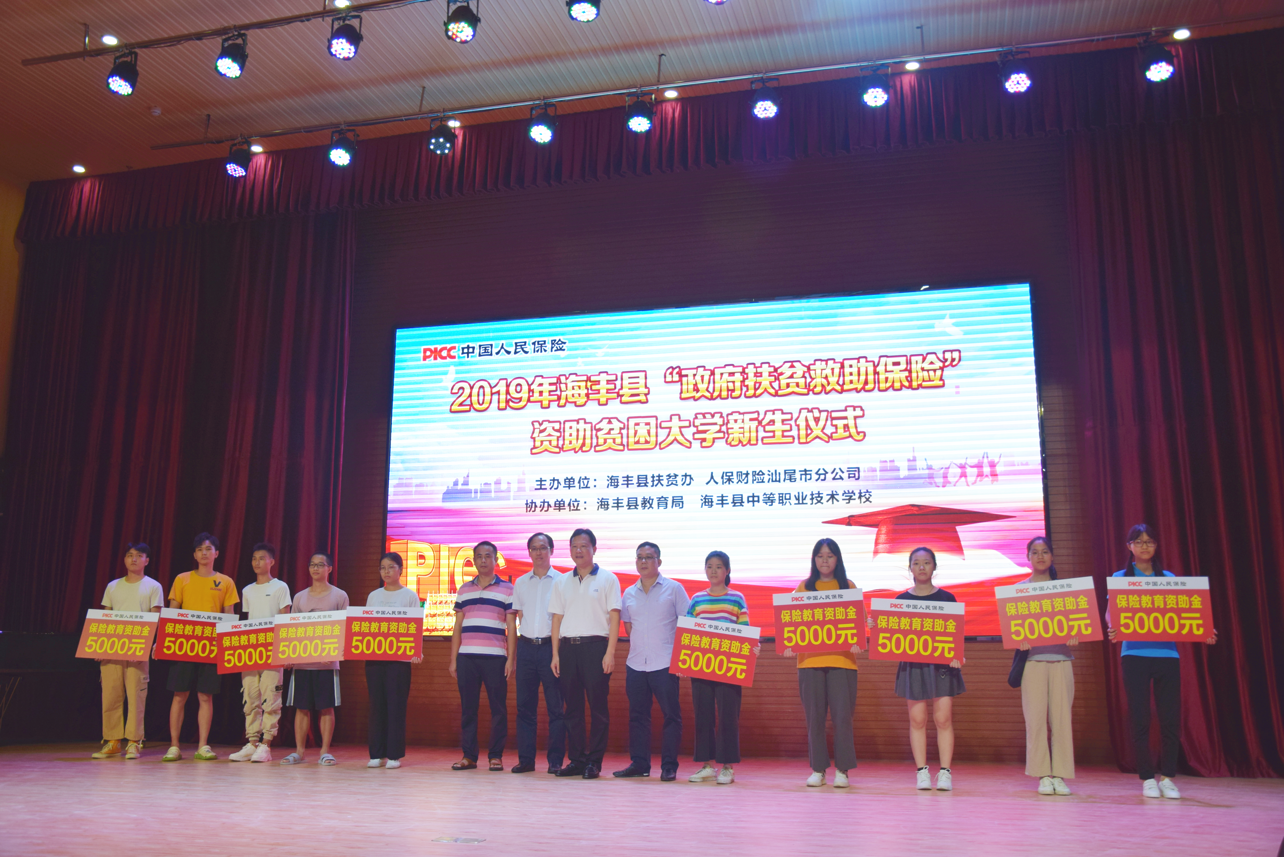 8月27日上午,海丰县扶贫办与人保财险pc蛋蛋(中国)开奖记录查询站 分公司在海丰县中等职业技术学校联合主办2019年海丰县“政府扶贫救助保险”资助贫困大学新生仪式,向该县符合资助条件的124名贫困家庭大学新生每人发放5000元资助款,共计62万元。