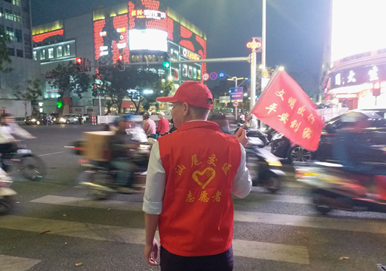 在文明交通活动中,交通志愿者们手持指挥红旗在晚下班高峰时间段走上交通繁忙的五十米大道十字路口,用旗子和口哨对过往行人和非机动车的不文明交通行为进行劝导,劝离停留在路口的“蓝牌车”,维护交通秩序。交通志愿者们坚持文明服务,细心劝导车辆行人严格遵守交通规则,并向市民宣传文明出行的交通知识,呼吁驾驶员和行人提高交通法治意识、安全意识和文明意识,自觉遵守交通规则,预防和减少道路交通事故,为市民营造一个安全的出行环境,携手共创文明城市。