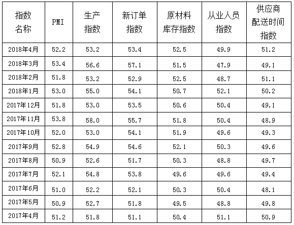 表 2017年4月-2018年4月广东省制造业PMI主要分项指数值表