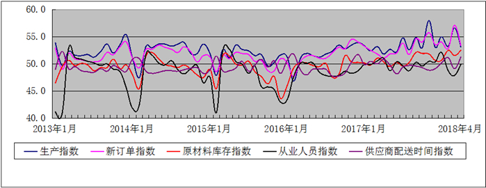 图2 2013年1月—2018年4月广东省制造业PMI分项指数趋势图
