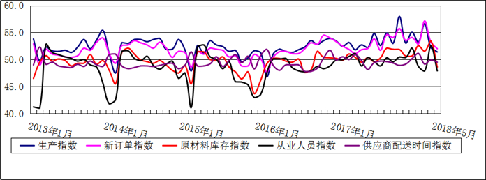 图2 2013年1月—2018年5月广东省制造业PMI分项指数趋势图
