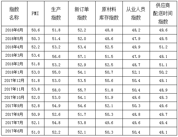 表 2017年6月-2018年6月广东省制造业PMI主要分项指数值表