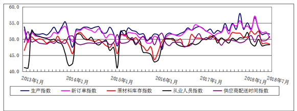 图2 2013年1月—2018年7月广东省制造业PMI分项指数趋势图