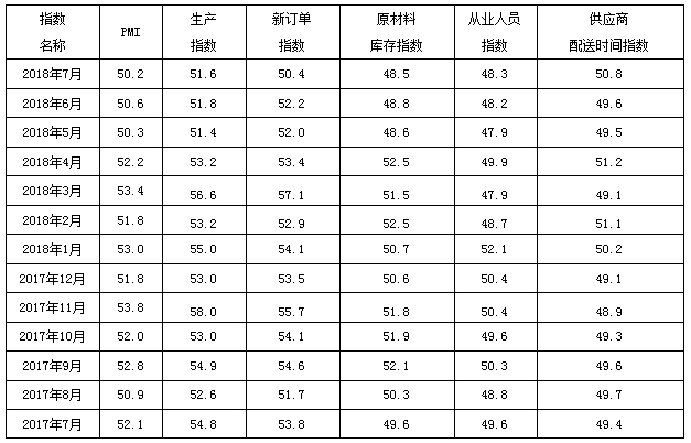 表 2017年7月-2018年7月广东省制造业PMI主要分项指数值表