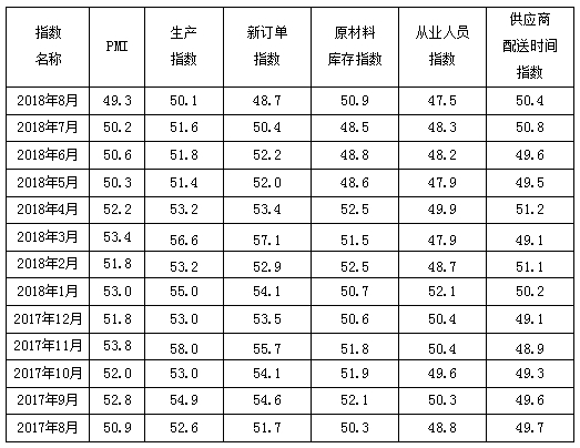 表 2017年8月-2018年8月广东省制造业PMI主要分项指数值表