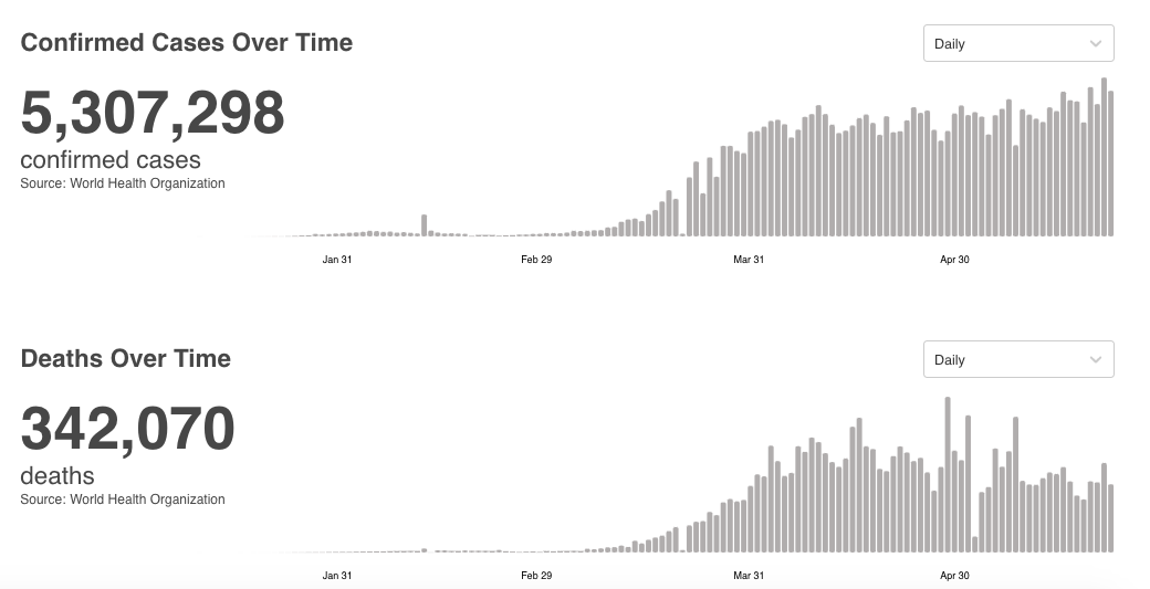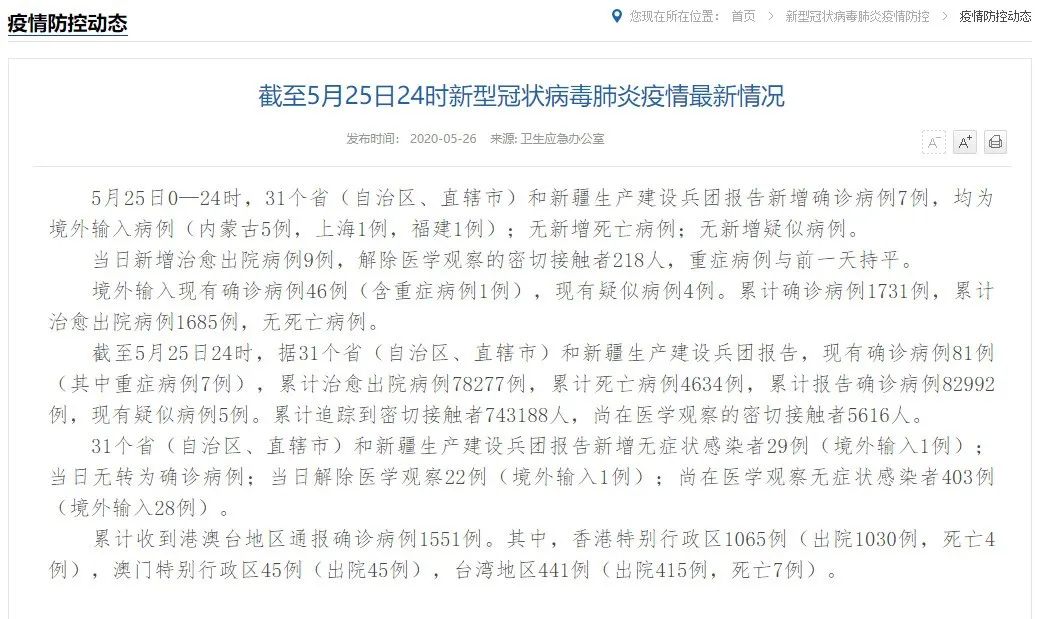 截至5月25日24时,据31个省(自治区、直辖市)和新疆生产建设兵团报告,现有确诊病例81例(其中重症病例7例),累计治愈出院病例78277例,累计死亡病例4634例,累计报告确诊病例82992例,现有疑似病例5例。累计追踪到密切接触者743188人,尚在医学观察的密切接触者5616人。