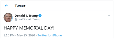 “阵亡将士纪念日快乐!”特朗普当地时间25日早上8时许用全大写英文字母发了这样一条推特。