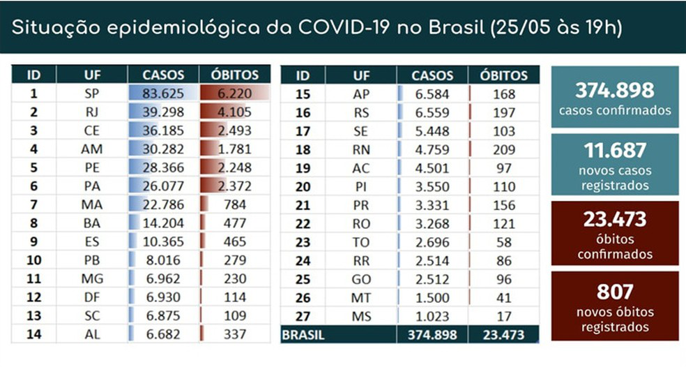根据巴西卫生部门25日数据,巴西累计确诊病例374898例,累计死亡病例23473例。